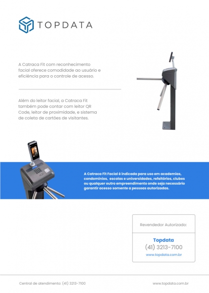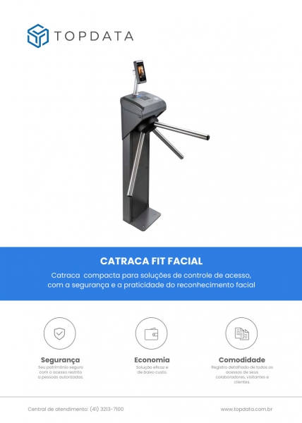 Leitores disponíveis - Leitor facial - Leitor de cartão de proximidade 125 KHz - Leitor de proximidade para smart card, padrão Mifare 13,56 MHz. - Leitor de QR Code e de códigos de barras tradicionais, como os padrões 2 de 5 intercalado e 3 de 9 Recursos - Capacidade para armazenamento de até 30.000 registros - Lista para controle de acesso de até 15.000 usuários - Até 100 tabelas de horário para controle de acesso - Relógio interno com precisão de 1 minuto por ano - Permite o cadastro de 10 funções especiais configuráveis - Permite a liberação do giro dos braços através de um botão externo - Função de contador de giros para visualização no display - Permite sinalização de seleção para revista - Display com backlight, de 2 linhas por 16 colunas - Teclado com 16 teclas de silicone, tipo manta - Pictogramas luminosos para indicação de giro liberado - Web server integrado para configuração - Comunicação TCP/IP 10/100Mbps - Disponível software de configuração e SDK de comunicação com a catraca Construção o Pedestal em aço carbono com pintura epóxi o Tampa em plástico injetado de alta resistência o Mecanismo com 3 braços em tubo de aço inox polido AISI 304, com durabilidade maior que 3.000.000 de giros o Opcionais:  Mecanismo antipânico com braço articulado  Leitor com capacidade para 20 mil faces  Sistema de coleta de cartões de visitantes Especificações técnicas - Alimentação: entrada 100 a 240 Vac 60Hz; Opcional: 12VDC - Consumo: 20,7W - Dimensões sem os braços: Largura: 300 mm; Altura: 1342 mm; Profundidade: 250 mm - Dimensões com os braços: Largura: 690 mm; Altura: 1342 mm; Profundidade: 690 mm - Peso: 25 Kg